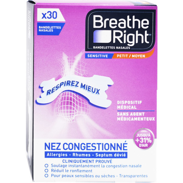 Les bandelettes nasales Sensitive BREATHE RIGHT sans substance médicamenteuse, sont des bandelettes en latex et souple qui adhèrent à la peau du nez. Elles élargissent les voies nasales en soulevant les narines et facilitent la respiration en améliorant le passage de l’air (31% en plus) La solution idéale pour soulager les nez encombrés et réduire les ronflements !