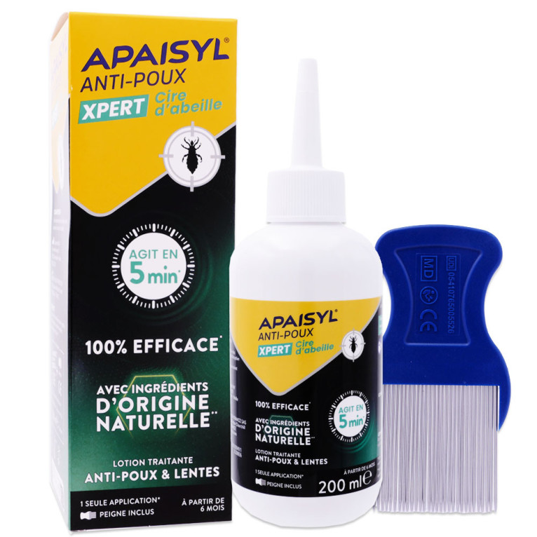 APAISYL XPERT CIRE D'ABEILLE ANTI POUX LOTION 200ML + PEIGNE est en vente en ligne sur le site de votre parapharmacie à prix discount, conçu pour éliminer les poux et les lentes de manière efficace.