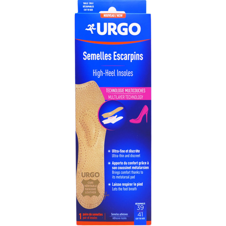 Les semelles escarpins d’URGO discount, des semelles en cuir véritable dans votre parapharmacie en ligne à prix discount, destinées aux pieds douloureux et fatigués pour assurer une marche confortable au quotidien, sans douleurs aux pieds. Taille 39-41.