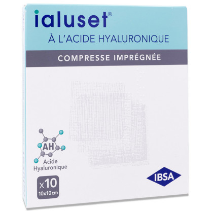 IALUSET COMPRESSE A L'ACIDE HYALURONIQUE 10 COMPRESSES 10X10CM est en vente en ligne sur le site de votre parapharmacie à prix discount, offrant une solution pour le soin des plaies non infectées, suintantes ou surinfectées, aiguës ou chroniques, telles que les ulcères de jambe.