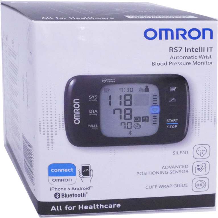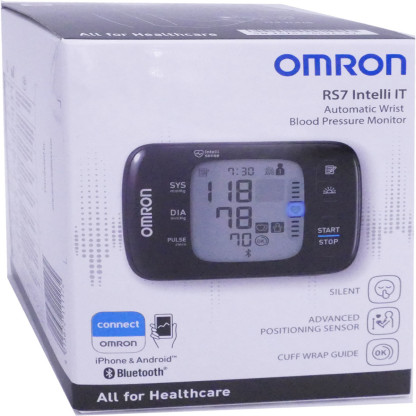 Le laboratoire OMRON conçoit des produits de gestion de santé afin de prévenir et améliorer la santé de chacun au quotidien. Le tensiomètre OMRON RS7 permet de mesurer jusqu’à 100 mesures automatiquement avec précision et ce pour 2 utilisateurs (date et heure de prise) et rapidement tous les types de tensions (systolique, diastolique) et les pouls irréguliers, et calcule automatiquement la moyenne des 3 dernières mesures prises. Il indique l’hypertension et les battements irréguliers. La taille du bracelet (21,5cm x 13,5cm) permet un gonflage et dégonflage confortable et automatique en toute sécurité. Il bénéficie de la technologique IntelliSense qui permet d’adapter automatiquement la pression de gonflage nécessaire à la prise de la tension. Très précis, très simple d’utilisation, son affichage est simplifié, ne bénéficie que d’un seul bouton. Son écran numérique permet une lisibilité claire avec niveau de batterie, et indicateur du bon positionnement du bracelet, d’hypertension et de battement régulier. Le système intelli IT permet de transférer par bluetooth les mesures prises par le tensiomètre sur votre smartphone instantanément. Un capteur de positionnement vous indique également si l'appareil est mal positionné. Dispositif médical validé cliniquement