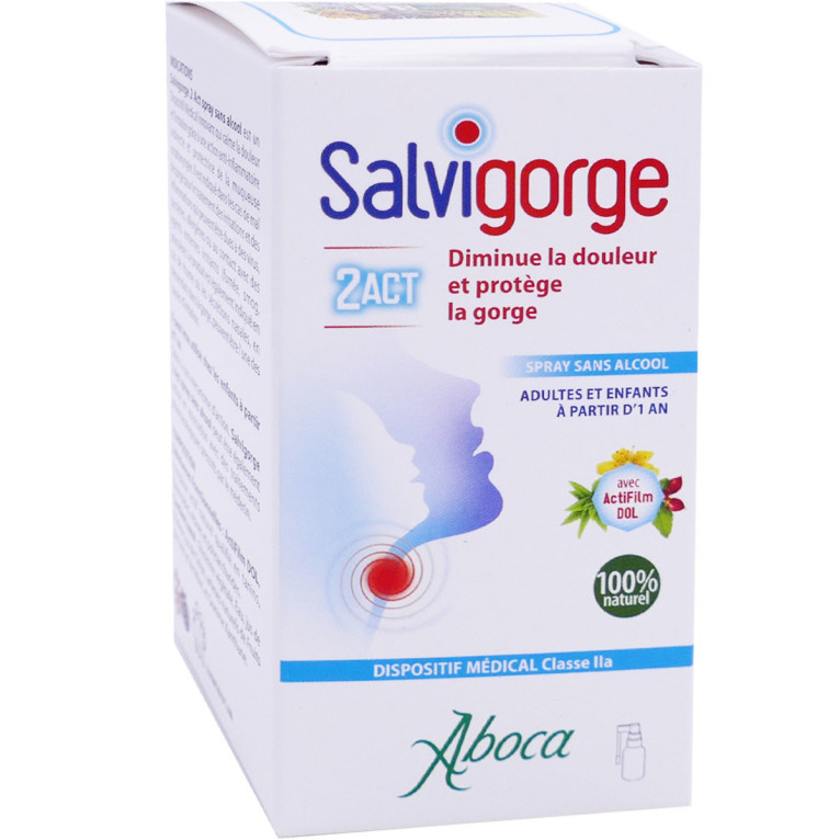Salvigorge Spray Sans alcool discount d’ABOCA un dispositif médical en spray à base de plantes à prix discount dans votre parapharmacie en ligne qui calme la douleur et l'irritation tout en protégeant la muqueuse oropharyngée.