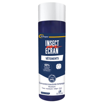 La gamme Insect Ecran du laboratoire COOPER est composée de produits répulsifs pour protéger des piqûres de moustiques, tiques, mouches et phlébotomes. La solution de trempage Insect Ecran permet de repousser les moustiques, les guêpes, les tiques, les aoûtats, les mouches, les punaises et les puces sur les vêtements, rideaux, tentes, moustiquaires, tissus, draps grâce à sa composition en perméthrine. En étant imprégnés, les insectes piqueurs n'iront pas piquer à travers les tissus par un effet barrière invisible. L'insecticide ne dégage aucune odeur. Il est résistant jusqu'à 2 mois, 5 lavages à 40°C