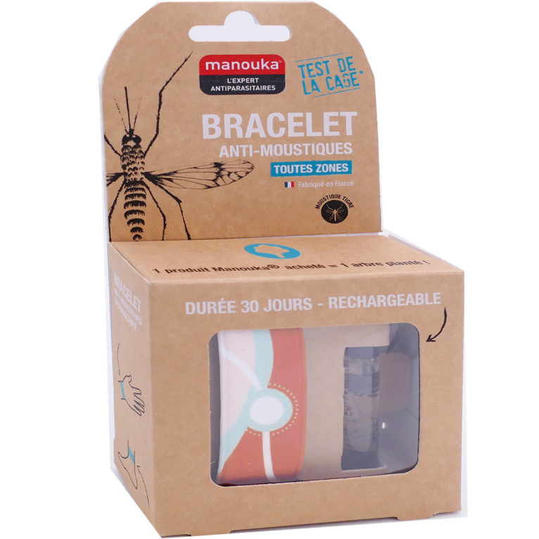 MANOUKA est une marque spécialisée dans le développement de produits anti-moustique innovants, colorés et ludiques, adaptés à tous les besoins : du bébé à la peau fine et délicate jusqu’au globe-trotter le plus téméraire. Le bracelet anti-moustique de MANOUKA, qui se place facilement au poignet ou à la cheville, est un produit révolutionnaire à base d’IR3535 (10%) et de citriodiol (5%) sans DEET. Il assure une protection anti-moustique (y compris moustique tigre) et autres insectes (tiques, mouches, taons, guêpes, abeilles) très efficace, jusqu’à 6 heures et une action répulsive sur un rayon de 1 m. Efficacité prouvée cliniquement par le test de la cage.