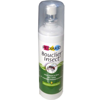 PEDIAKID est une gamme dédiée aux enfants, spécialement développée pour apporter des solutions efficaces, sans effet indésirable à tous leurs petits désordres : sommeil, appétit, tonus…Les produits PEDIAKID sont élaborés avec des actifs 100% d’origine naturelle, pour offrir le meilleur et le plus doux de la nature aux plus jeunes. Le spray Bouclier Insect, délicatement parfumé enrichie en eau florale de lavandin bio et huiles essentielles 100% pures et naturelles, est un produit révolutionnaire à base de Géraniol (actif d’origine naturelle), qu’il suffit de pulvériser sur le visage et le corps pour assurer une protection anti-moustique et autres insectes (tiques, mouches, taons) très efficace pendant 8 heures. Après l’application, la peau délicatement parfumée aux senteurs fraîches et agréables, est douce et apaisée. Sans paraben, sans insecticide, sans alcool, ni phénoxyéthanol