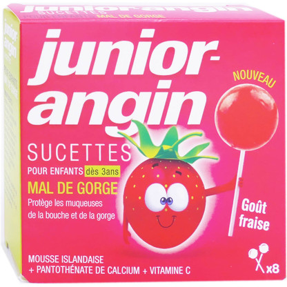 Junior Angin des laboratoires Melisana Pharma est un dispositif médical qui calme la gorge irritée, soulage les douleurs en déposant sur la surface des muqueuses de la gorge et de la bouche un film protecteur, favorise la régénération des tissus des muqueuses et de la peau, et agit sur la prodution de collagène pour une muqueuse renforcée, par la présence d’extrait de mousse d’Islande et de vitamines (B5, C). Le mal de gorge est calmé, les douleurs sont soulagées. Au gout de fraise, les enfants aimeront les sucettes Junior Angin !