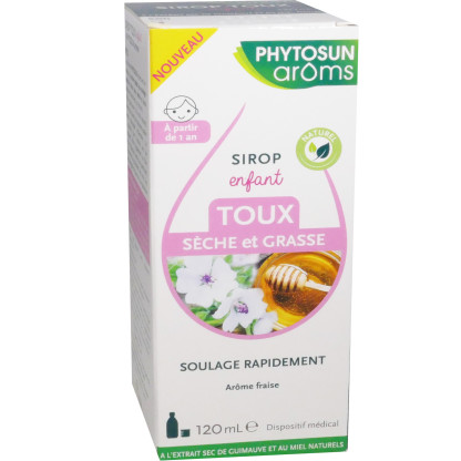 Le sirop Toux sèche et grasse Enfant de PHYTOSUN AROMS discount, l’expertise en aromathérapie dans votre parapharmacie en ligne, pour ce sirop aux huiles essentielles qui soulage les toux de l’enfant et redonne du confort rapidement. A partir de 1 an