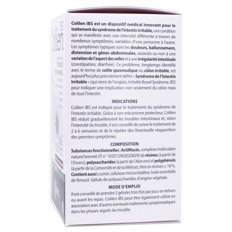 Colilen IBS est une solution novatrice conçue pour traiter le syndrome de l'intestin irritable, qui se manifeste de manière variée, avec différents symptômes selon chaque individu. Colilen IBS gélules fonctionne grâce à son complexe moléculaire exclusif (IT n° 102012902020829) nommé ActiMucin, qui est constitué de résines, de polysaccharides et de polyphénols. Ce dernier, par un mécanisme physique et mécanique, se lie à la surface de la muqueuse intestinale, créant ainsi un film protecteur qui préserve la muqueuse des agressions des substances irritantes.