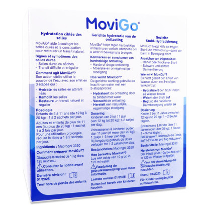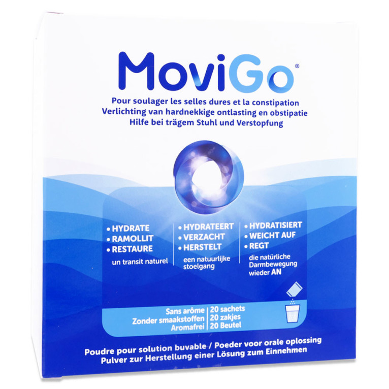 Avertissements : En cas de grossesse ou d'allaitement, demandez un avis médical avant d'utiliser MoviGo.Contre-indications :sténose intestinale ;perforation intestinale ;maladie inflammatoire de l'intestin (maladie de Crohn, rectocolite hémorragique...) ;obstruction intestinale (occlusion intestinale, iléus).
