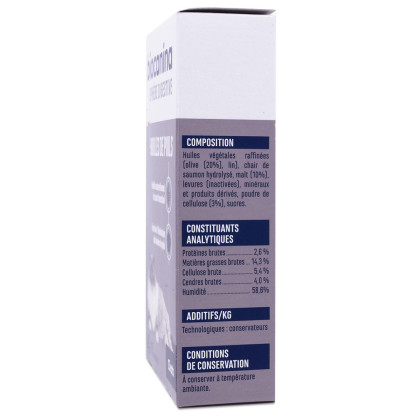 Complément alimentaire pour chats. Huiles végétales raffinées, chair de saumon hydrolysé, malt, levure, minéraux et produits dérivés, poudre de cellulose, sucres.