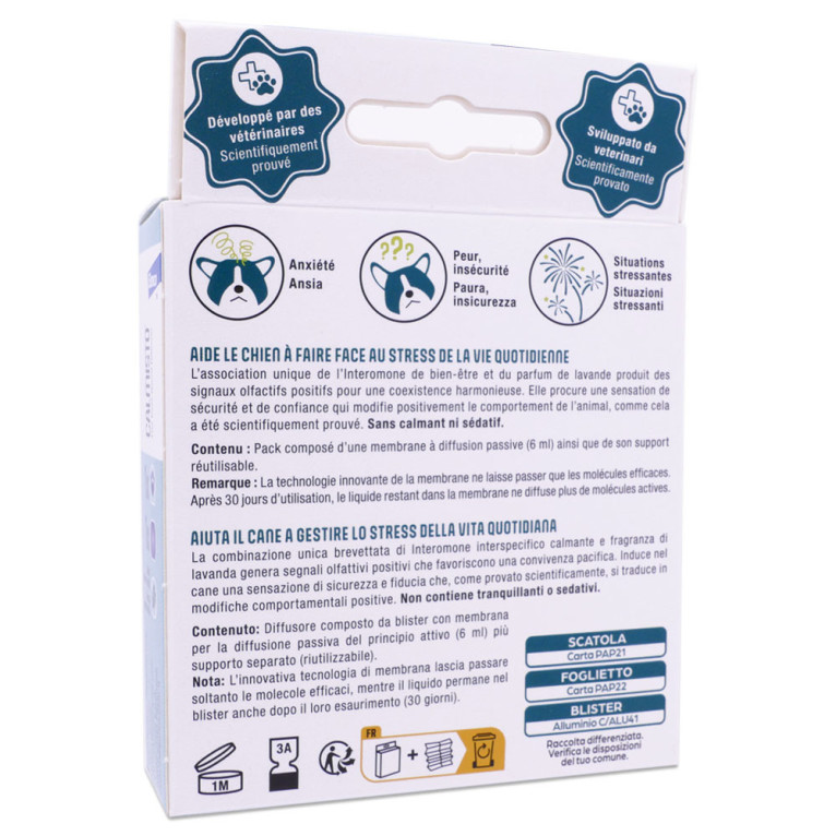 Élaboré par la marque Elanco, ce diffuseur est conçu pour contribuer au bien-être des chiens en aidant à maintenir un environnement apaisant. Sa formule unique contient des ingrédients naturels qui soutiennent la fonction de relaxation, favorisant un climat de tranquillité pour votre animal. La texture liquide de la recharge de 6 ml permet une diffusion continue et homogène dans l'air ambiant. Le coffret comprend un diffuseur et une recharge de 6 ml. Le diffuseur est facile à utiliser et ne nécessite pas d'être branché à une prise électrique, assurant une diffusion optimale et constante des actifs apaisants. La recharge est spécialement formulée pour contribuer à réduire le stress et l'anxiété chez les chiens, créant ainsi un environnement serein. Une solution idéale pour votre routine quotidienne de soin animal, apportant calme et sérénité à votre compagnon à quatre pattes.