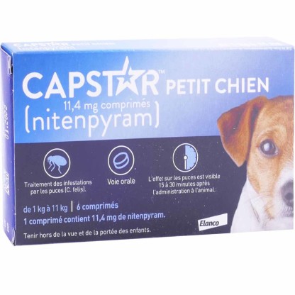 Capstar Petit Chien 11,4mg discount de NOVARTIS, le traitement antipuces à effet immédiat dans votre parapharmacie en ligne à prix discount, pour éliminer les puces chez les petits chiens de moins de 11kg en seulement 24 heures même pour les femelles en période de lactation.