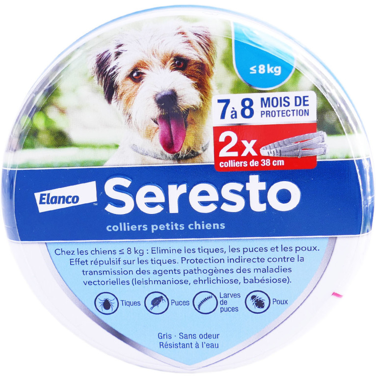 Le Collier Insectifuge pour Chien de SERESTO dans votre parapharmacie en ligne à prix discount, pour une action efficace et longue durée jusqu’à 8 mois sur les parasites du chien (puces et tiques). Petits chiens moins de 8kg