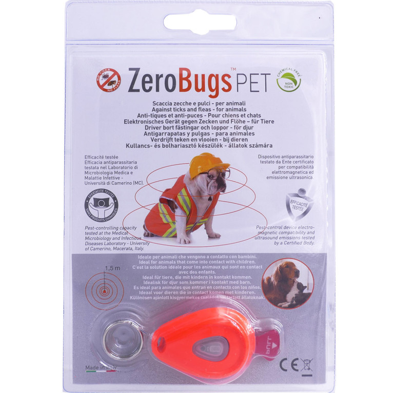 Anti-tiques et Antipuces de ZEROBUGS Pet est un petit appareil électronique astucieux pour éloigner, sans danger pour l’animal, les puces et les tiques. Les ultrasons vont former une barrière protectrice autour de l’animal dans un rayon d’environ 1,5 mètres. La batterie a une durée de vie d’environ 10 mois. Testé par un organisme certifié il est non toxique, ne contient pas de substances chimiques et ne présente aucun danger pour l’animal.