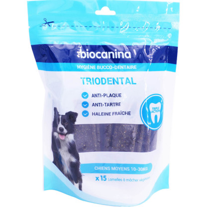 TRIODENTAL discount de BIOCANINA, des friandises appétentes végétales à mâcher indiqué en cas de tartre ou mauvaise haleine du chien de 10 à 30kg, dans votre parapharmacie en ligne à prix discount.