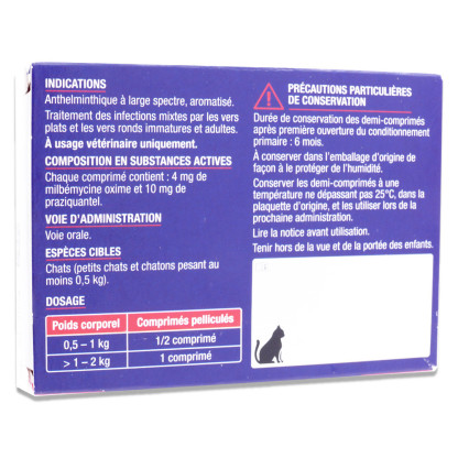 Avertissements : Il est conseillé de ne pas administrer ce vermifuge à un chaton trop jeune ou en dessous d’un certain poids sans avis vétérinaire. En cas de doute sur l’état de santé du chat, de gestation ou de traitement concomitant, l’avis d’un professionnel est recommandé. Conserver le produit hors de portée des enfants et respecter les conditions de stockage indiquées par le fabricant.