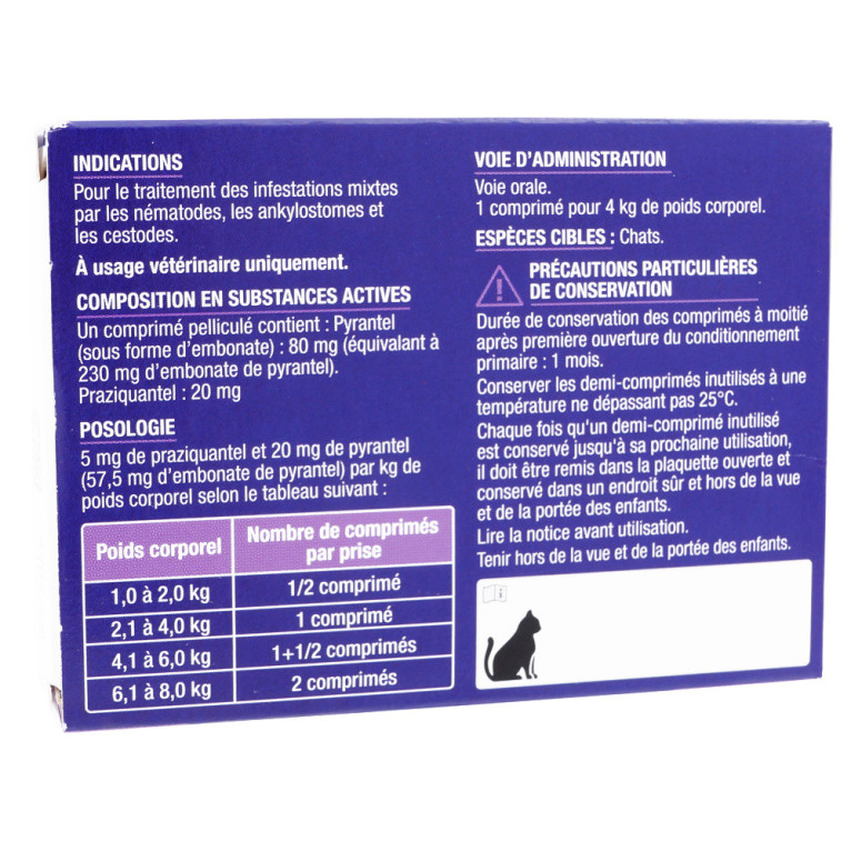 Fabriqué par Viatris, ce produit se présente sous la forme de comprimés sécables, offrant une administration facile et précise. Les comprimés contiennent 80 mg de pyrantel et 20 mg de praziquantel, ingrédients actifs reconnus pour leur efficacité dans le domaine vétérinaire. Ces substances agissent en perturbant le métabolisme des parasites, facilitant ainsi leur élimination du système digestif de l'animal.