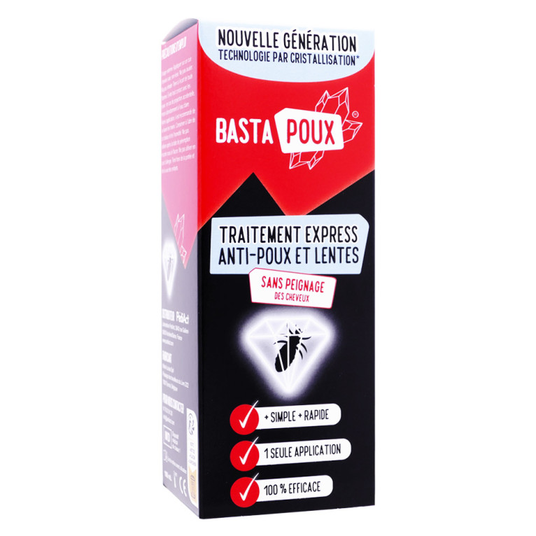 BASTA POUX TRAITEMENT EXPRESS ANTI POUX & LENTES 100ML : Découvrez une solution rapide et efficace pour éliminer les poux et lentes dès la première utilisation et pendant 72 heures, en vente en ligne sur le site de votre parapharmacie à prix discount.