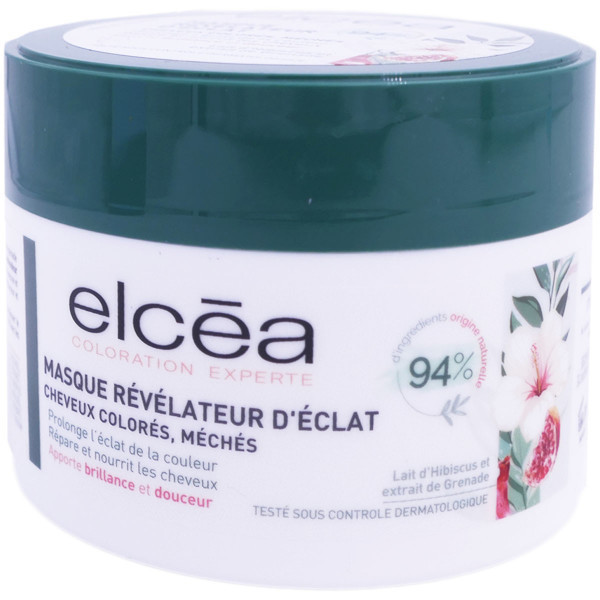 ELCEAMasque Révélateur d’Eclat des laboratoires ELCEA, à la texture soyeuse délicatement parfumée, est un soin capillaire spécialement conçu pour réparer, protéger les cheveux colorés et nourrir en profondeur la fibre capillaire. Sa formule associe du lait d’hibiscus, des phytocéramides végétaux et un extrait de grenade pour nourrir le cheveu dès la racine, régénérer la fibre capillaire, révéler l’éclat naturel de la couleur, protéger les cheveux des agressions extérieures et fixer durablement les pigments de coloration. La chevelure retrouve éclat et couleur intense, brillance, souplesse et vigueur. Elle est facile à coiffer. Testé sous contrôle dermatologique