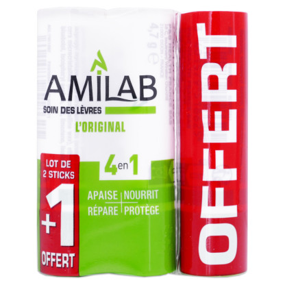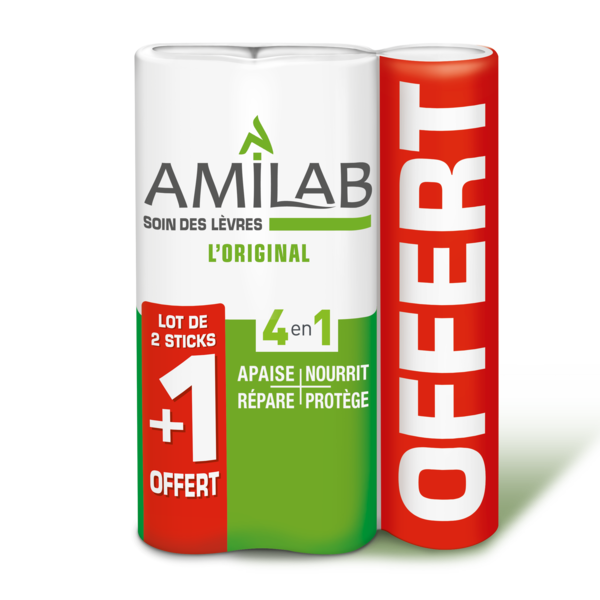 AMILAB SOIN DES LÈVRES L'ORIGINAL 4 EN 1 2 STICKS + 1 OFFERT est disponible en vente en ligne sur le site de votre parapharmacie à prix discount.