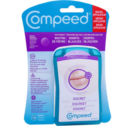 Le laboratoire COMPEED conçoit des pansements pour les problèmes de pieds (cors, ampoules) et des produits pour les boutons de fièvre, et durillons. Bouton de fièvre Patch est destiné à protéger et traiter les boutons de fièvre dès leur apparition. Il soulage la douleur de façon durable, masque dès la pose du patch le bouton de fièvre, diminue les rougeurs et les suintements, réduit les risques de contamination et favorise le processus de cicatrisation en limitant la formation de croûtes ou de vésicules. Une boîte contient 15 patchs à usage unique.