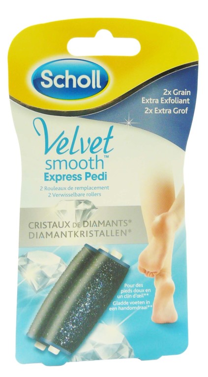 Depuis plus d’un siècle, la marque Scholl propose des produits alliant efficacité, technologie, confort et esthétique pour améliorer la santé des consommateurs en prenant soin de leurs pieds. Les rouleaux sont adaptés à la râpe Velvet Smooth. Aux micro-grains extra-exfoliants avec de la poudre de cristaux de diamants (de synthèse), le rouleau élimine les peaux épaisses et mortes de la peau sous les pieds. La recharge agit par mouvements réguliers pour éliminer la totalité des callosités par une pression manuelle sur la râpe légère à moyenne. Le rouleau extra-exfoliant va éliminer en profondeur les peaux épaisses. En quelques minutes la peau morte est éliminée, les pieds sont lisses, et retrouvent toute leur douceur et leur souplesse. Les recharges se changent en moyenne après 12 utilisations.