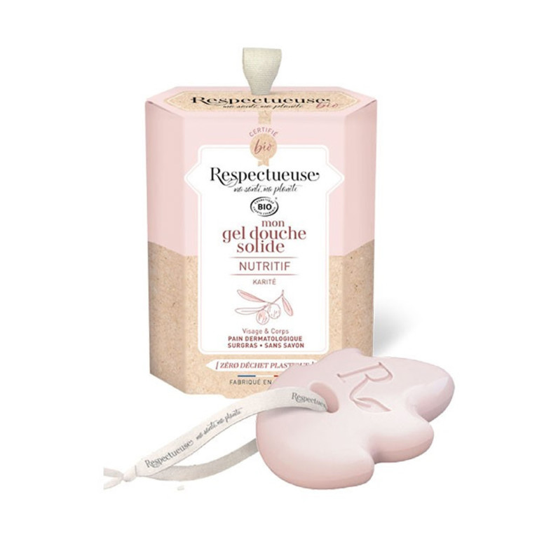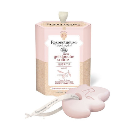 Le laboratoire Respectueuse Bio a créé ce gel douche solide nutritif sans savon, pour répondre aux besoins des peaux sèches et sensibles.
