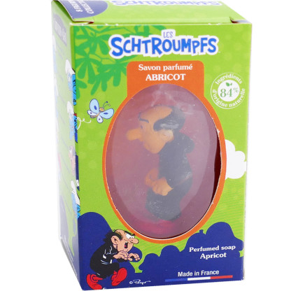 Les savons solides « Schtroumphs » COMPTOIR DU BAIN sont composés d'agents nettoyants doux surgras, testés sous contrôle dermatologique, pour le respect de la peau même la plus fragile. Appliqué sur la peau mouillée les savons délivrent une mousse douce. Avec différents parfums et leurs figurines amusantes à l’intérieur des savons, ils sauront satisfaits les envies et feront de la toilette un vrai plaisir pour les plus petits et les grands ! Gargamel ravira les enfants par ses senteurs gourmandes d’abricot.