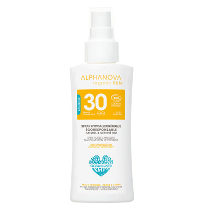 Les soins ALPHANOVA, prennent soin des peaux sensibles et réactives du visage par leur composition naturelle biologique qui sont testés dermatologiquement et sont hypoallergéniques pour le respect de la peau et de l'environnement. ALPHANOVA Sun BIO SPF30 certifiée biologique, protège la peau des rayons du soleil UVA/UVB grâce aux filtres 100% minéraux non toxiques écoresponsables associé à de l’huile de jojoba bio et de l’aloe vera bio pour prendre soin de la peau. Sans conservateurs chimiques, sans paraben, et sans filtres chimiques, cette crème solaire respecte la peau et l’environnement. Résistant à l’eau, offrant une haute protection solaire, La peau est efficacement protégée instantanément et pour longtemps. En spray petit format, la crème solaire permet de couvrir toutes les zones même celles les plus difficiles à atteindre, .et de s’emporter partout avec soi dans les valises cabines. Pour le respect de la planète le flacon spray est fabriqué en plastique végétal issu de la canne à sucre sans impact carbon pour la nature. Testé sous contrôle dermatologique, sans paraben, sans parfum, sans conservateur chimique ni oxyde de zinc.