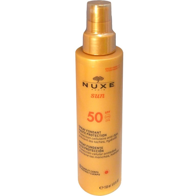 Nuxe, contraction de Nature et Luxe, développe depuis 25 ans des soins cosmétiques raffinés, élaborés avec des actifs végétaux précieux, sans huile minérale ni matière animale hormis les produits de la ruche, pour offrir des produits associant avec le plus bel équilibre : nature, performance et sensualité. La gamme NUXE Sun propose des soins spécialement conçus pour assurer une protection solaire optimale et sublimer la peau. Le spray fondant haute protection fluide et fondant, à la fragrance chaleureuse d’orange douce, fleurs de tiaré et vanille, est composé de filtres solaires et d’actifs puissants antioxydants (Extraits de Riz, Romarin ) associés à de la fleur de Kau Pe et de Jacinthe d’Eau, pour protéger la peau des rayons UVA/UVB, hydrater l’épiderme et l’apaiser, et offrir une protection cellulaire anti-âge tout en sublimant la peau pour un hâle sublime et un fini satiné. Résiste à l’eau et à la transpiration, photostable