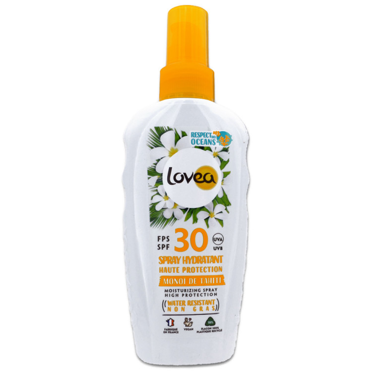 LOVEA SPRAY HYDRATANT SPF30 MONOI DE TAHITI 150ML en vente en ligne, sur le site de votre parapharmacie à prix discount, est un produit de protection solaire efficace et agréable à utiliser. Visage et corps
