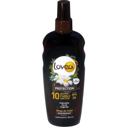 La marque LOVEA des laboratoires Biocos est composée de soins de beauté et solaires naturels et biologiques aux parfums ensoleillés, destinés à toute la famille, pour prendre soin de la peau et des cheveux et les sublimer au quotidien. Spray Huile sèche SPF10 au Monoï de Tahiti LOVEA est composée de Monoï véritable secret des tahitiennes pour ses vertus exceptionnelles. A la texture non grasse, ce soin à la faible protection (SPF10) assure nutrition et hydratation de la peau et sublime le bronzage tout en protégeant faiblement des rayons du soleil. La peau est délicatement parfumée aux senteurs exotiques, et incroyablement douce. Sans paraben