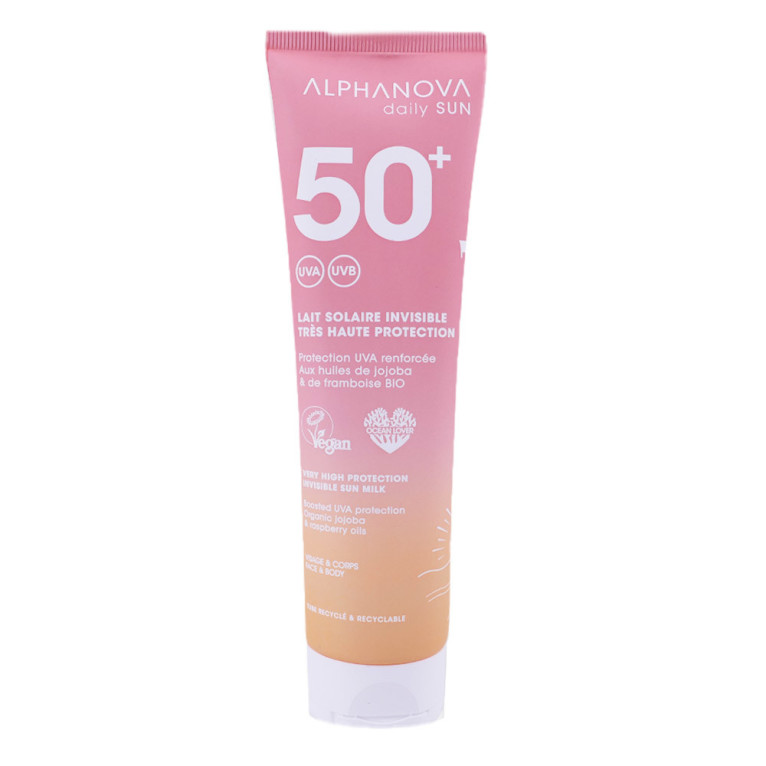 ALPHANOVA Daily Sun Lait Solaire invisible SPF50+ discount, le soin solaire naturel très haute protection pour le visage et le corps, dans votre parapharmacie en ligne à prix discount. Pour toute la famille (à partir de 3 ans).
