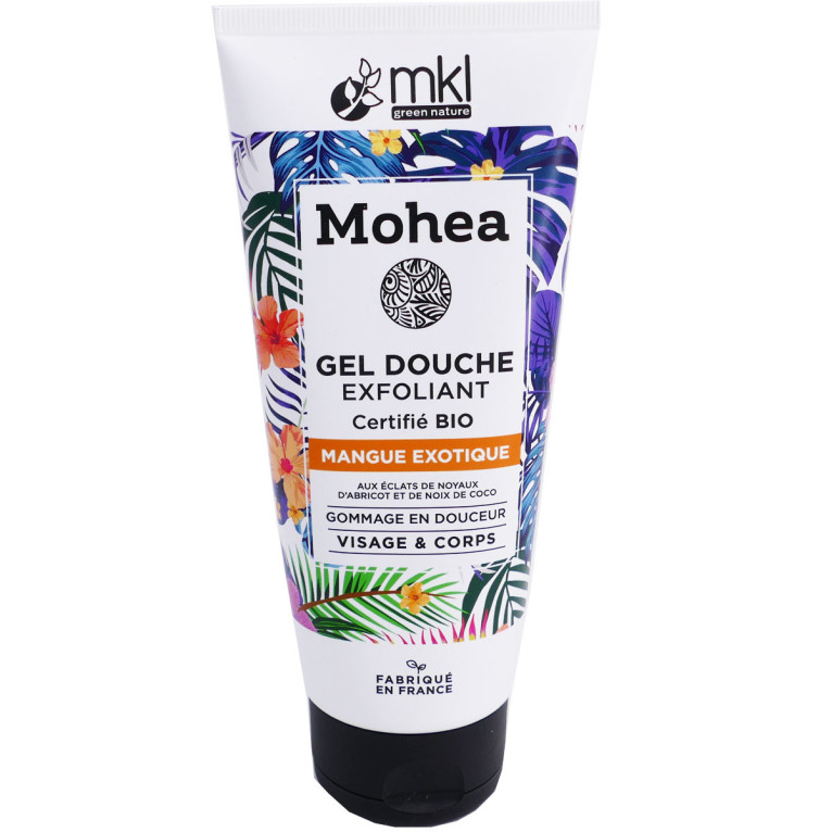 Le Gel-douche Exfoliant Bio MOHEA de MKL Green Nature discount, le soin nettoyant et exfoliant à la mangue exotique pour nettoyer et gommer en douceur la peau sans l’agresser. Visage, Corps. Pour tous types de peaux