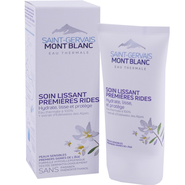 Le laboratoire SAINT-GERVAIS développe des produits dermo-cosmétiques élaborés avec de l’eau thermale de SAINT-GERVAIS Mont Blanc du massif alpin riche en minéraux aux propriétés réparatrices apaisantes, et cicatrisantes, pour répondre à tous les besoins des peaux même les plus fragiles. Le Soin Lissant Premières rides est un soin anti-âge spécialement formulé pour lisser la peau, protéger et retrouver de la jeunesse des peaux normales à sèches des femmes dès 30 ans. Sa formule associe de l’eau thermale pure Mont Blanc (75%), un extrait d’Edelweiss des Alpes (issu du commerce équitable), des agents hydratants anti-radicalaires (vitamine E, carcinine, glycérine végétale). L’ADN des cellules de la peau est protégé de l’apparition des signes de l’âge et des agressions extérieures (soleil, pollution,…), la peau est lissée pour estomper les rides installées, intensément hydratée et apaisée. Sa texture légère fond instantanément sur la peau pour la laisser douce avec un parfum frais des alpes. Elle retrouve sa jeunesse, son éclat, sa souplesse, et sa douceur dès l’application. Testé sous contrôle dermatologique, hypoallergénique, sans paraben, et sans phénoxyéthanol.
