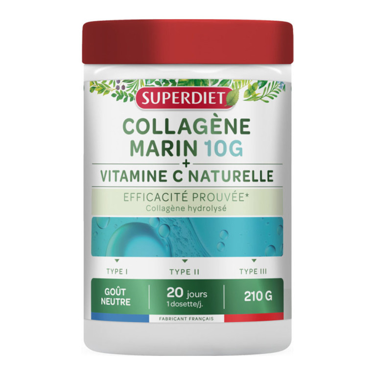 Le laboratoire SuperDiet propose un complément alimentaire à base de collagène marin hydrolysé et de vitamine C naturelle. Le corps produit naturellement du collagène, cependant sa production diminue avec l'âge ou en raison d'une pratique sportive intense. La vitamine C contribue à la formation normale de collagène pour assurer la fonction normale des os, des cartilages et de la peau.
